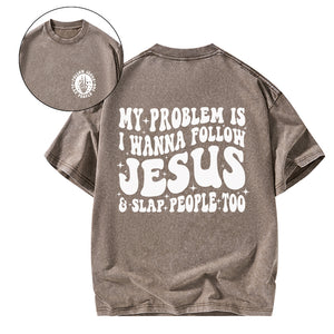 GC-WTSFK24090601 Follow Jesus And Slap People Funny Christian Washed T-Shirt
